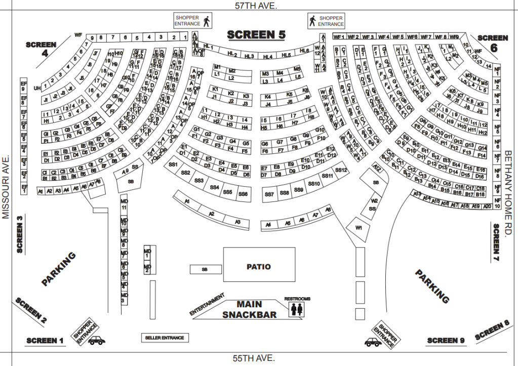 Plan your visit to the Glendale Swap Meet in Glendale, AZ using our detailed Glendale Swap Meet map. Navigate the market with ease and explore vendor areas, snack bars, beer gardens, entertainment zones, and other family-friendly activities throughout the market. For added convenience, you can view or download the map PDF below to print and bring with you on market day, helping you make the most of your visit to the Glendale Swap Meet. |